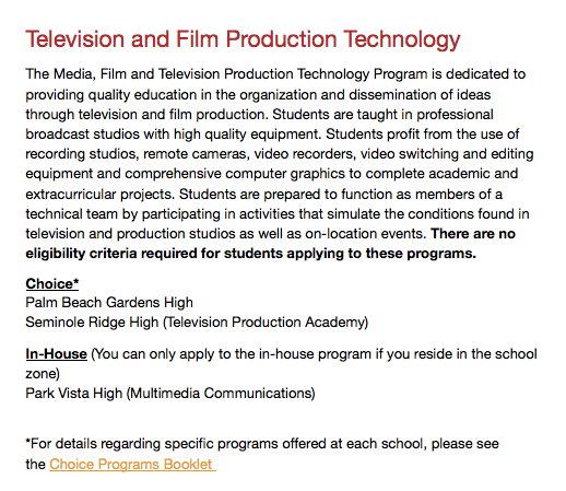 Incoming students for the 2014-2015 school year can apply for the Seminole Ridge Television Production Academy at https://mypbchoiceapp.com/apply